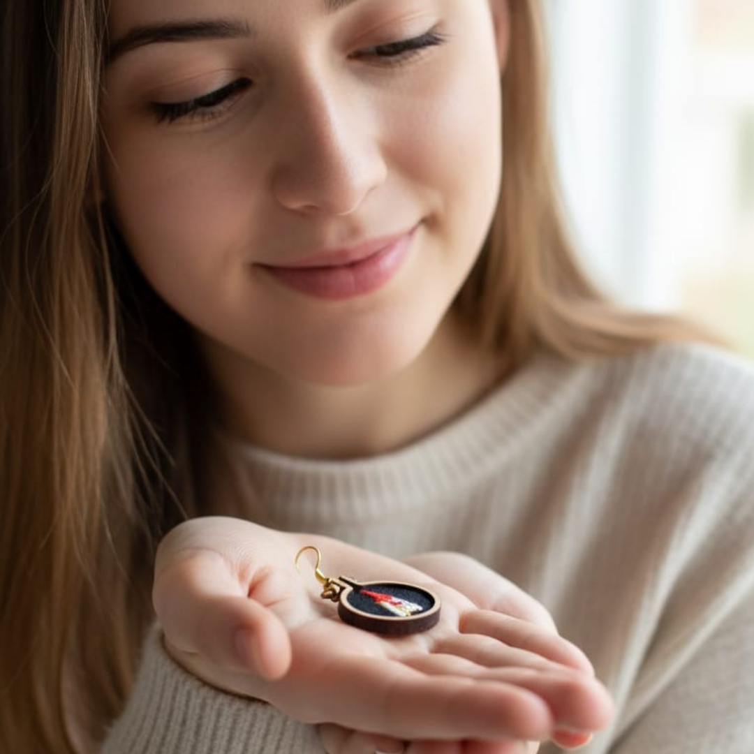 He transformado el bordado tradicional en piezas de bisutería contemporánea para mujeres que buscan algo diferente. Mis pendientes y colgantes son: